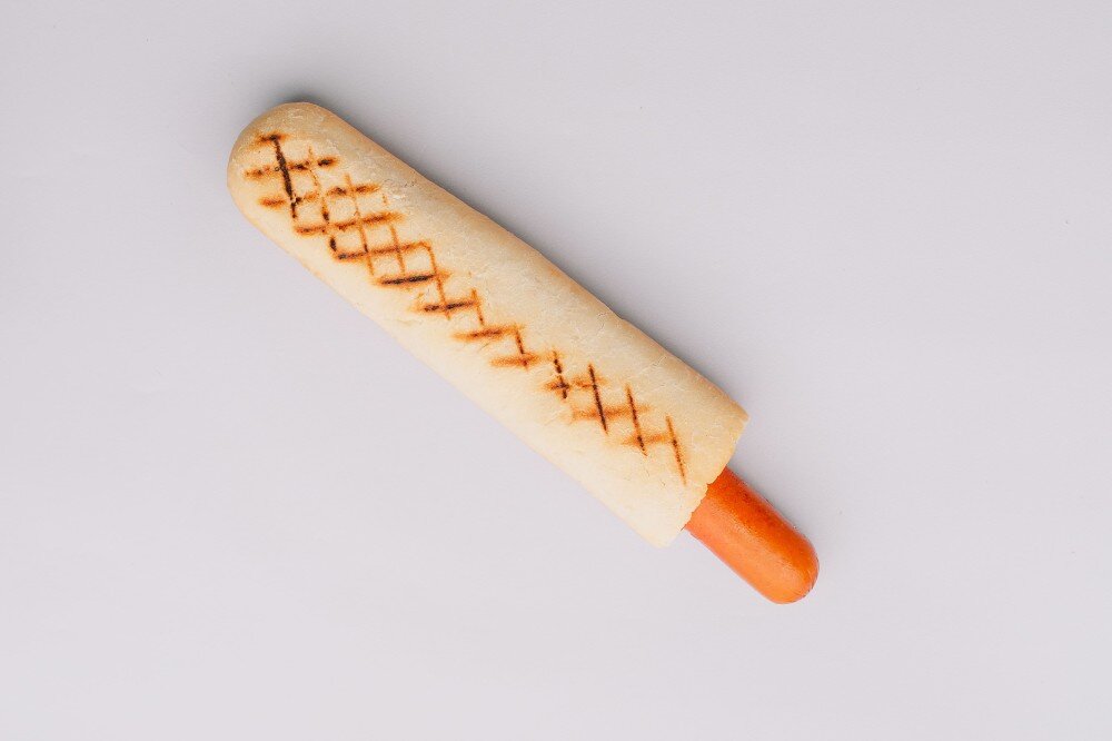 Французский хот-дог Говяжья сосиска гриль в багете. Соус красный, горчица